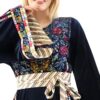 القطعة مصنوعة من قماش المخمل الألماني الفاخر الذي يمنح ملمسًا ناعمًا وانسيابية مذهلة في الحركة، ويعكس فخامة الألوان في تباينٍ رائع مع تطريزات حريرية دقيقة تتناثر بألوان الزهور لتروي حكاية أنثوية تنبض بالجمال والتفاصيل المترفة.