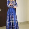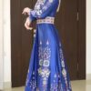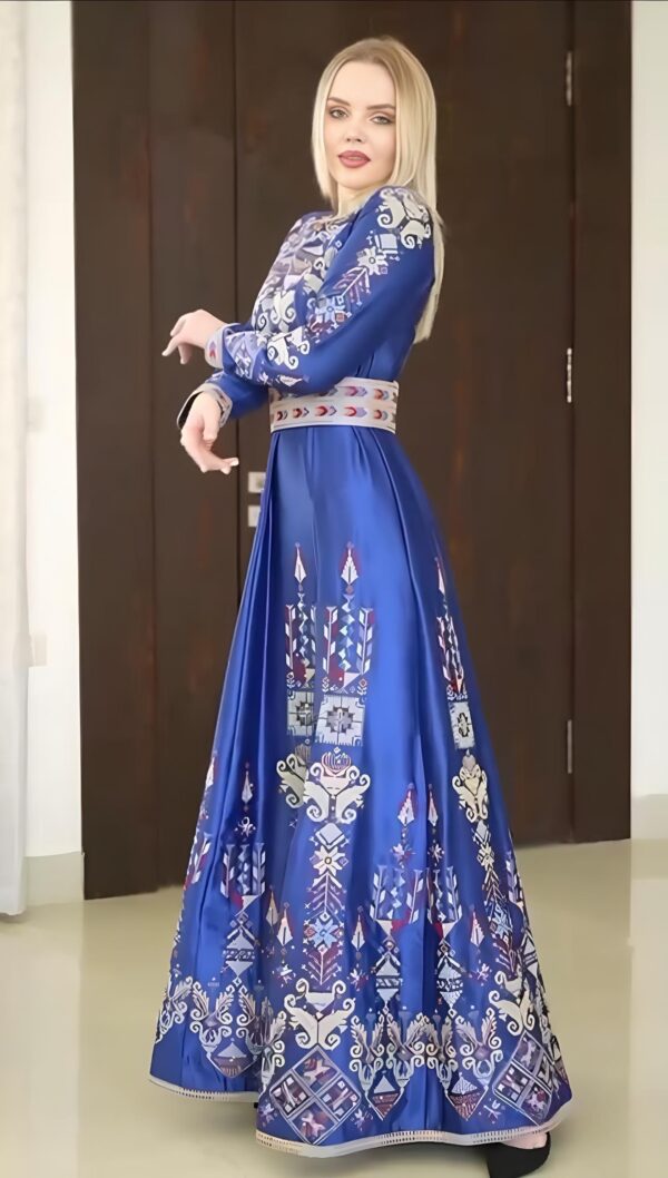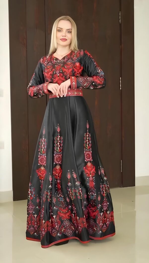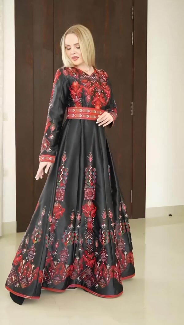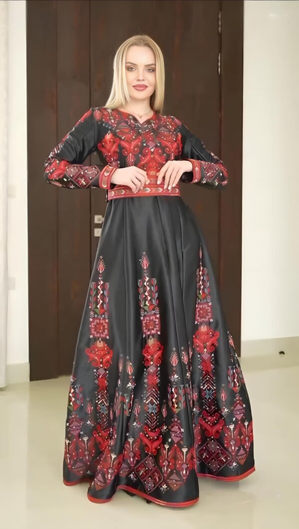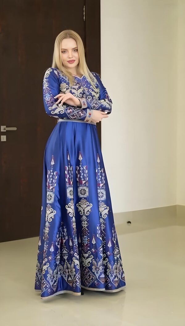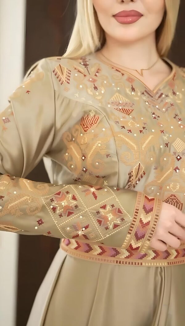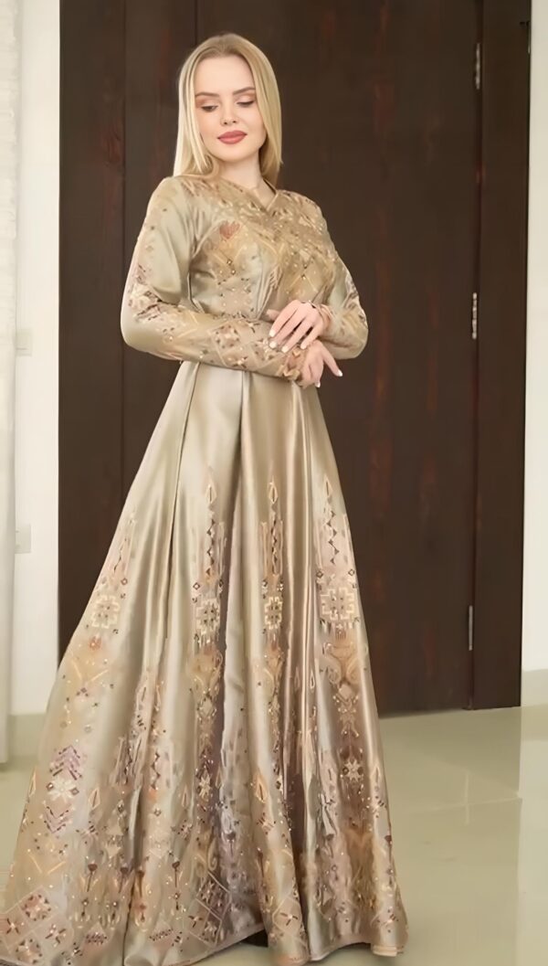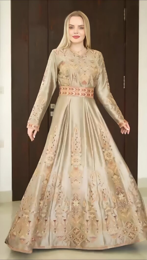 فستان فاخر مصنوع من قماش ستان ألماني فخم يتميز بلمعته الناعمة وانسداله الأنيق، مطرز بخيوط الحرير اللامعة التي تضيف لمسة رقي وتميّز للتصميم. يأتي بقصّة طويلة وانسيابية تمنحك إطلالة ملكية مستوحاة من التراث العصري.