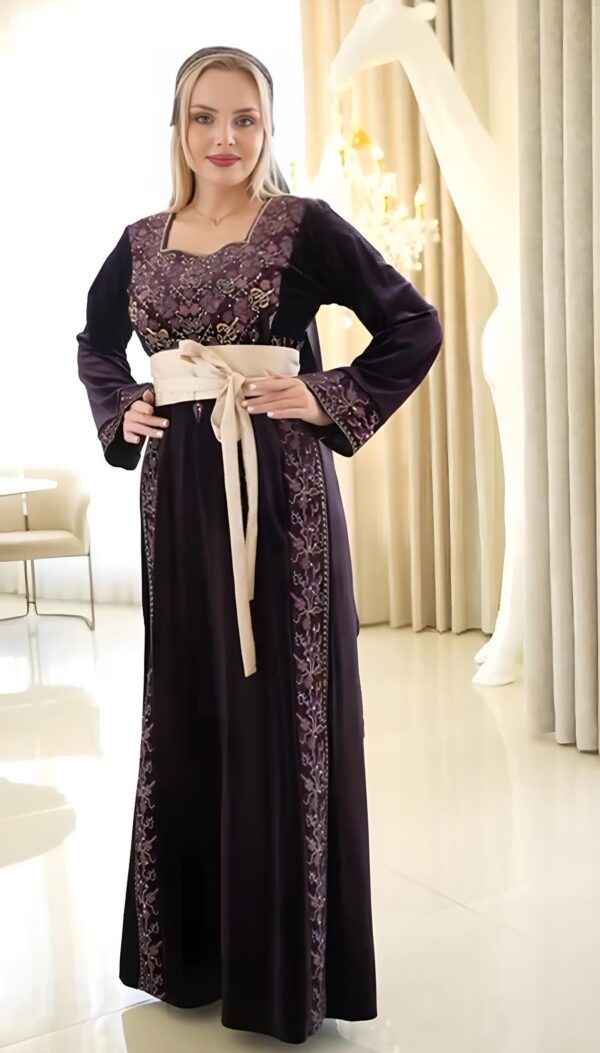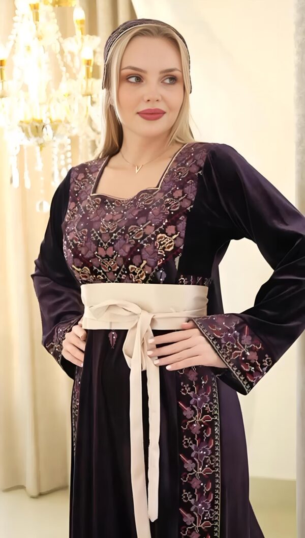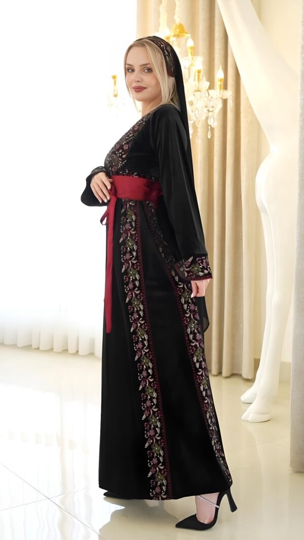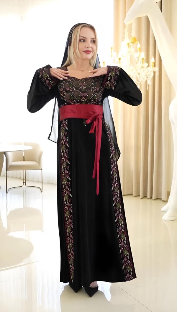 ويأتي الثوب مع شال أنيق وحزام ساتان فاخر يمكن ربطه بعدة طرق ليمنحك شكلاً مميزاً كل مرة، ويُبرز جمال القوام بلمسة أنثوية ناعمة تضيف المزيد من الفخامة إلى حضورك. تصميم يجمع بين الأصالة الفلسطينية بطابعها التراثي الأنيق والفخامة العصرية التي تناسب أرقى المناسبات.