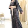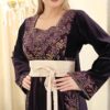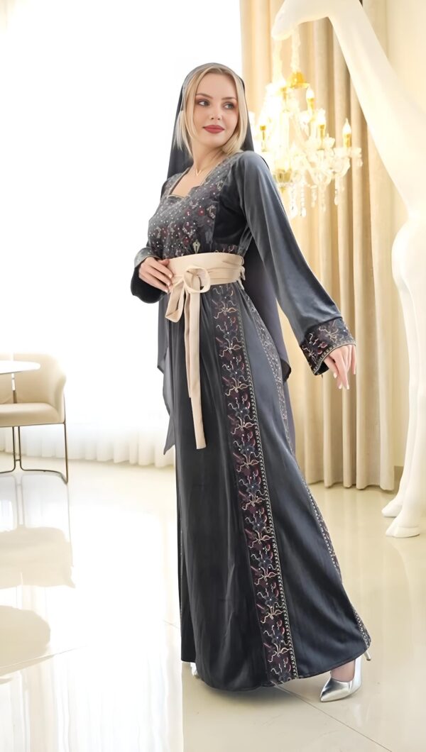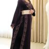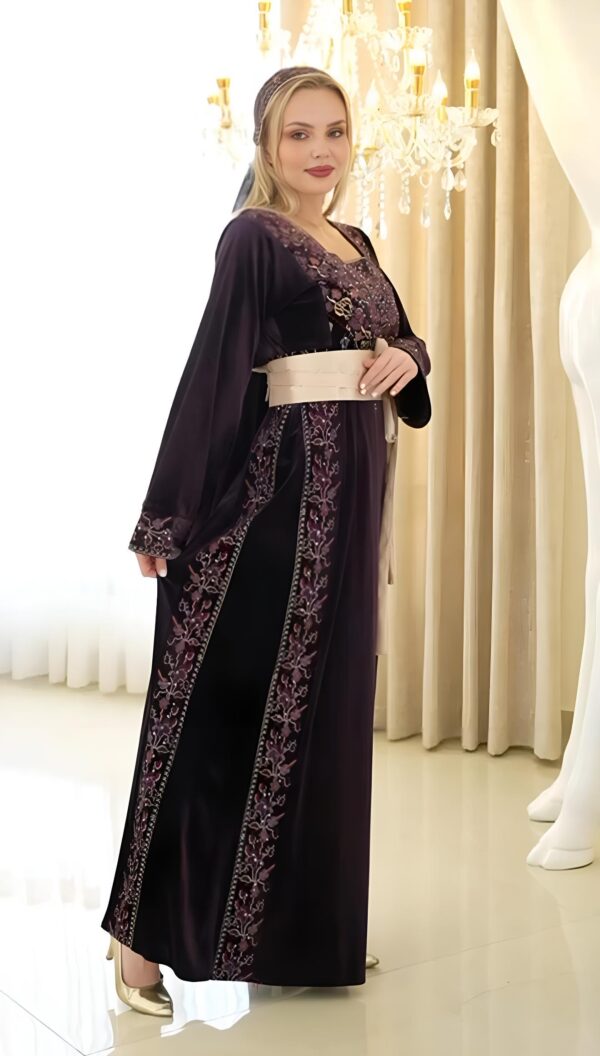 تألقي بإطلالة لا تشبه سواك مع ثوب السندس المخملي المصنوع من أجود أنواع المخمل الألماني المعروف بلمعانه الفاخر وملمسه الحريري الناعم. يزدان الثوب بتطريزات فنية دقيقة تمتد على الصدر والأكمام وجوانب الثوب، لتجعل كل تفصيلة فيه لوحة متكاملة من الرقي والجمال.