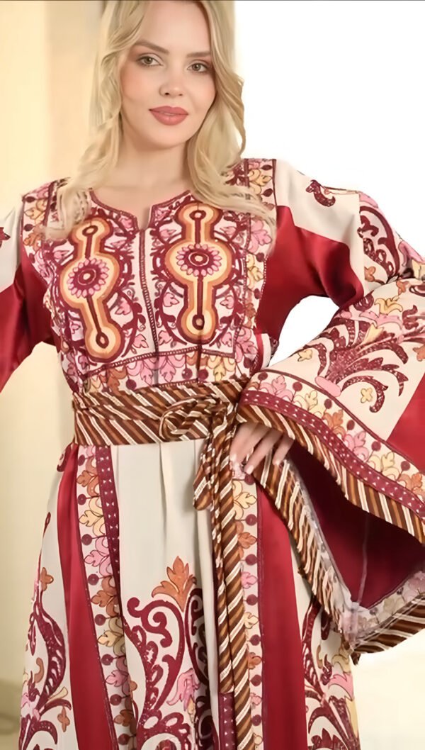 الحزام المرفق من قماش الصاية يبرز جمال التصميم ويحدد الخصر بأسلوب أنيق، ليمنحك مظهراً أكثر تناسقاً وجاذبية. يمكن تنسيقه بعدة طرق لإضفاء طابع شخصي يناسب ذوقك الخاص.