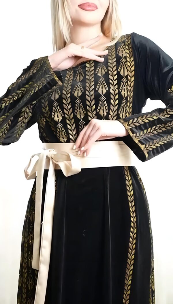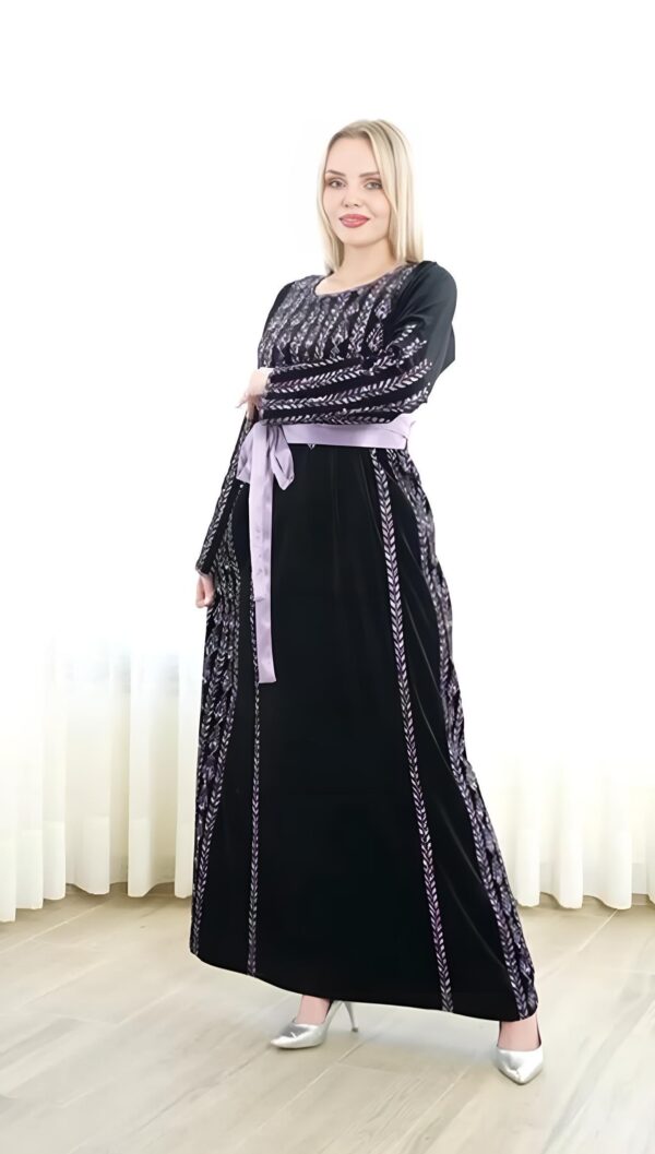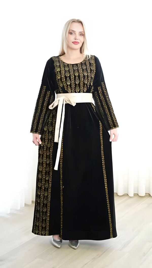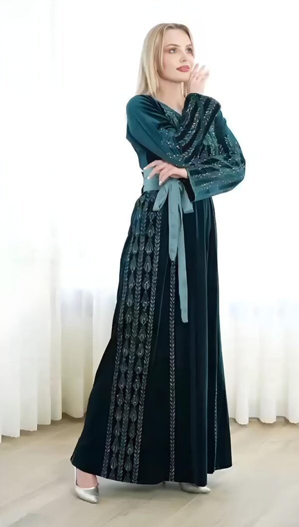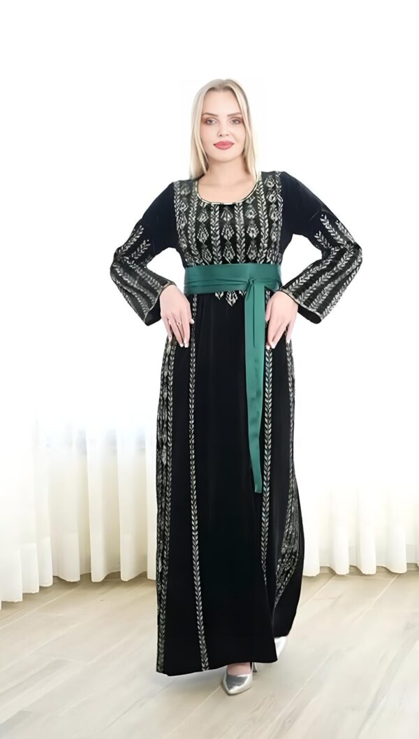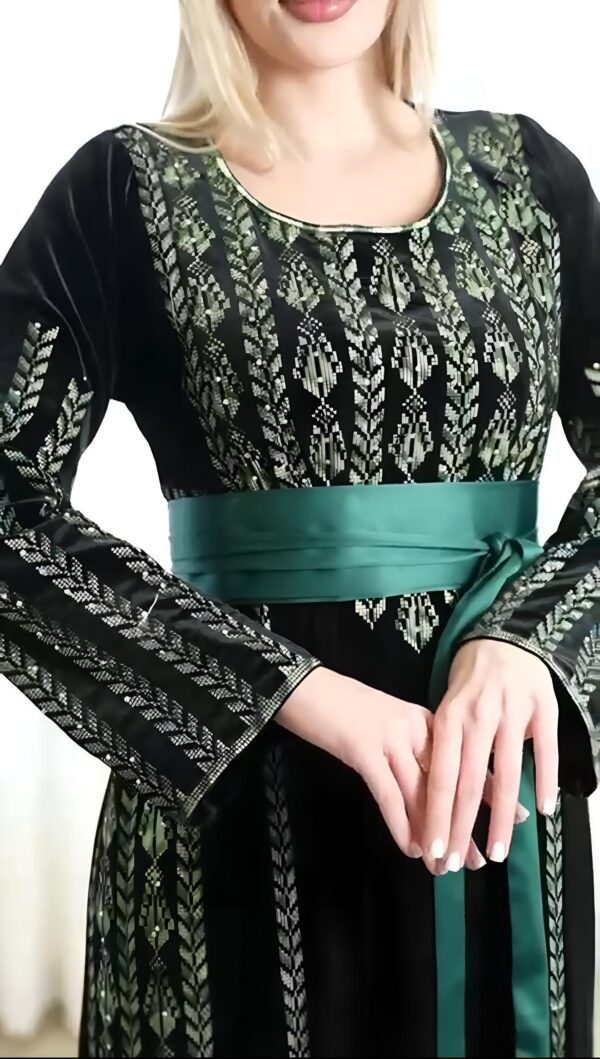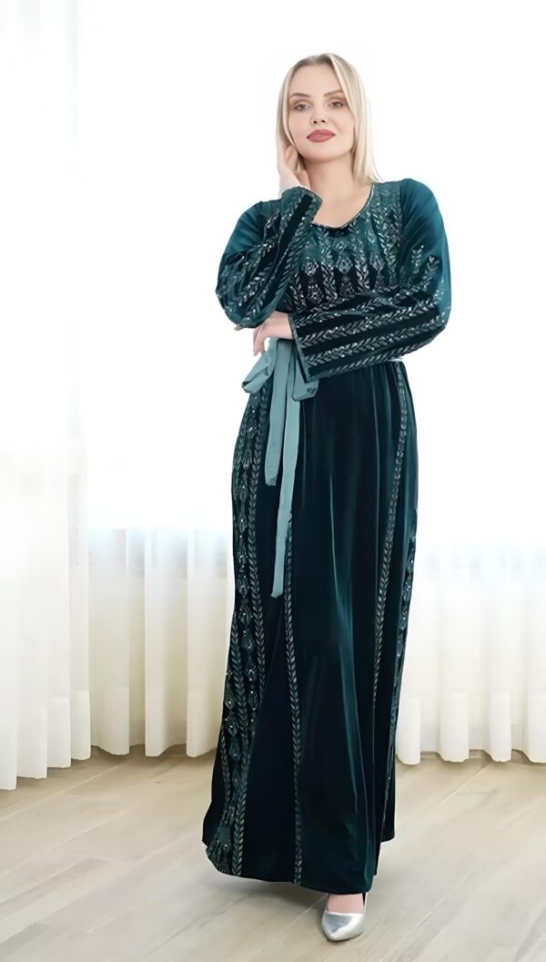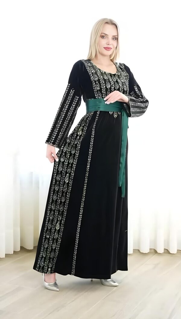 ثوب الزيتون – فخامة المخمل الألماني ولمسة الستان الراقية