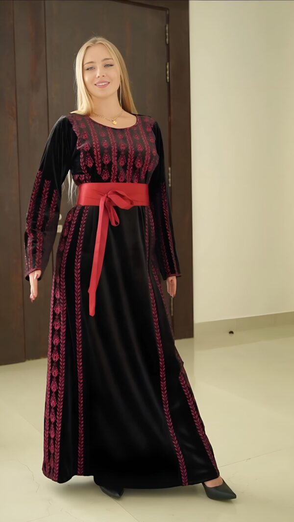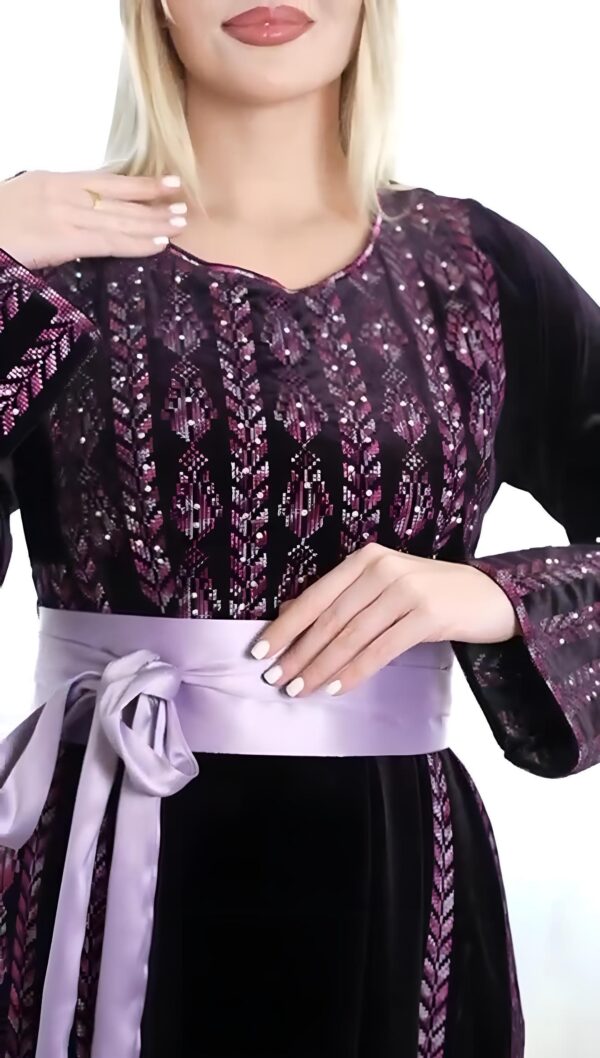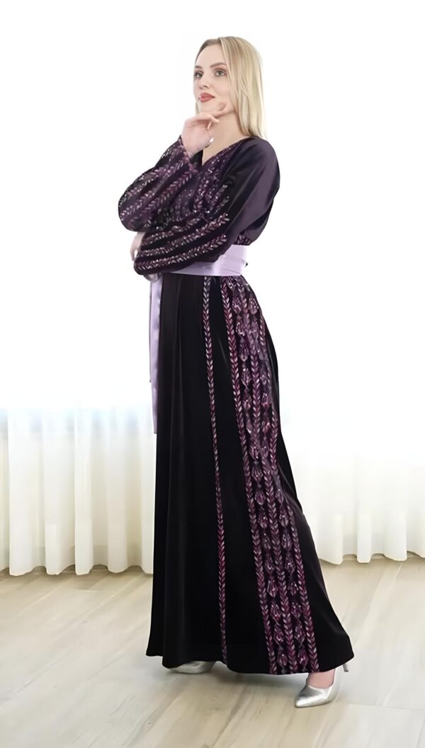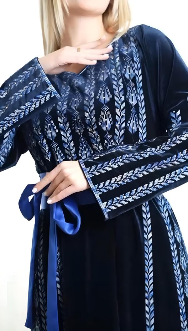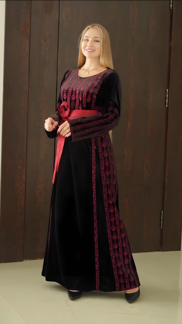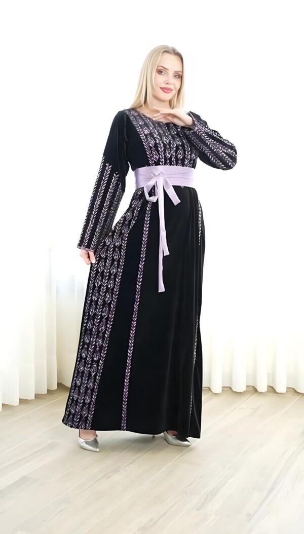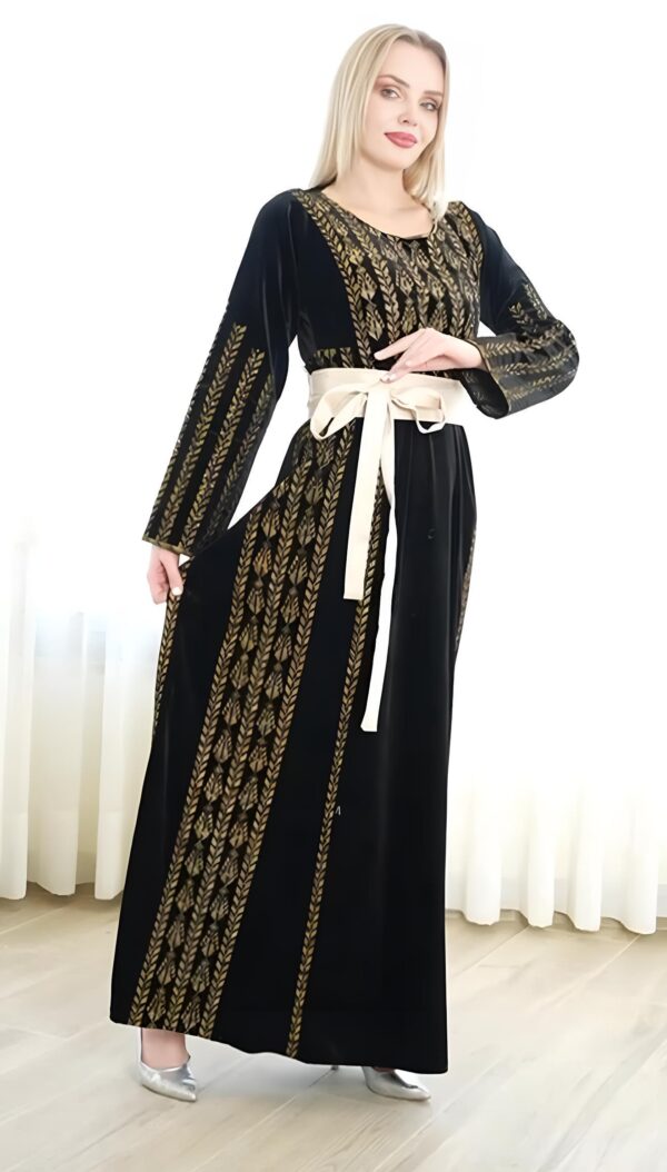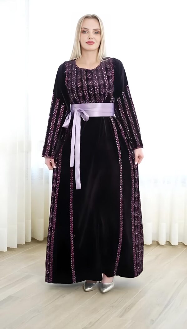 ثوب الزيتون – فخامة المخمل الألماني ولمسة الستان الراقية