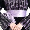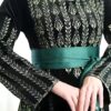 يأتي الثوب مزوّدًا بحزام من قماش الستان الفاخر، ينسدل برقة حول الخصر ليبرز جمال القوام ويضيف لمسة من التوازن بين الفخامة والأنوثة. الحزام يمكن ربطه بأسلوب بسيط أو على شكل عقدة أنيقة لإضفاء لمسة شخصية على الإطلالة.