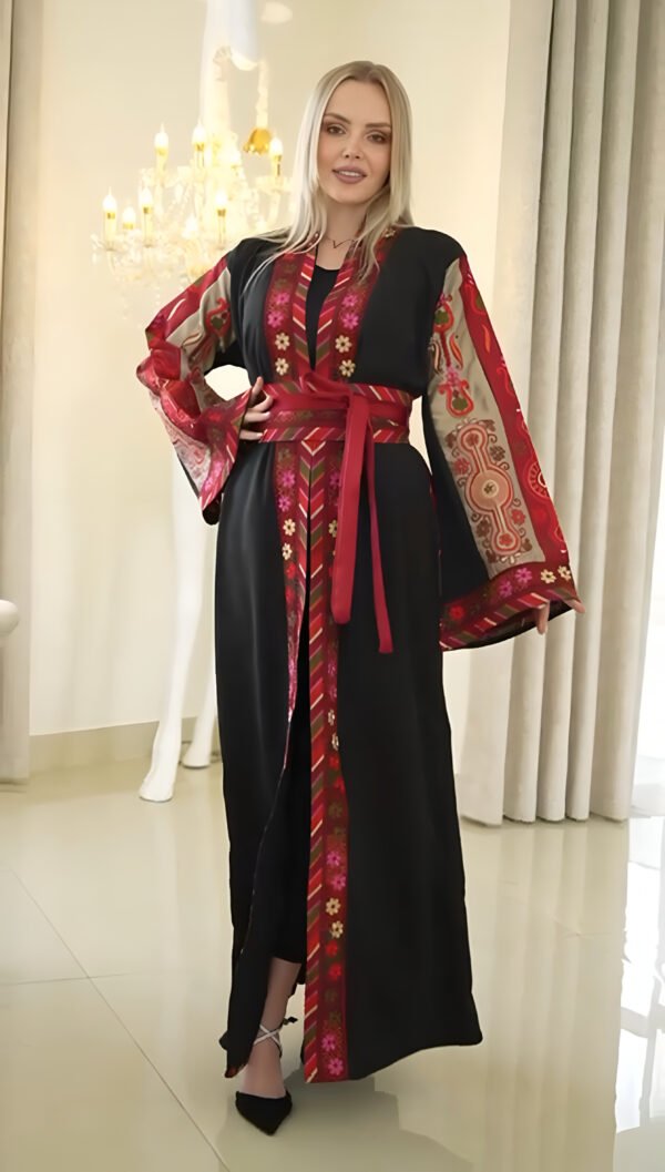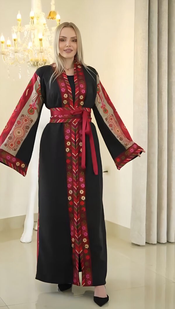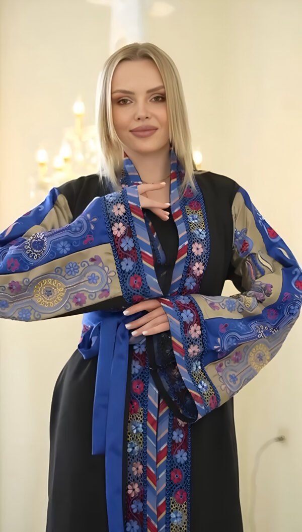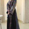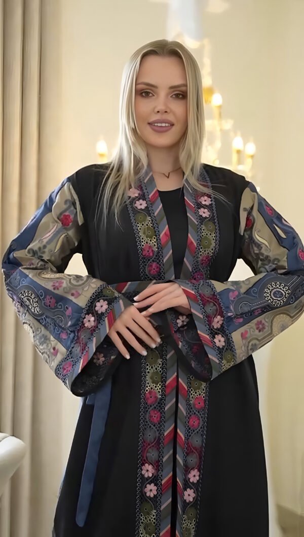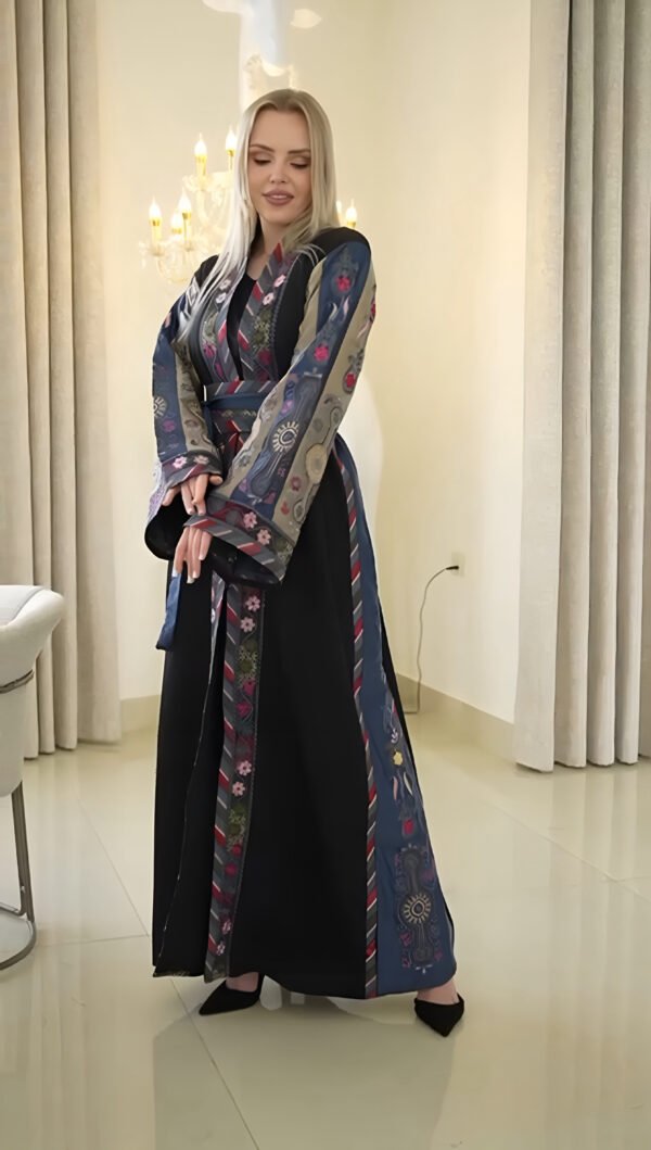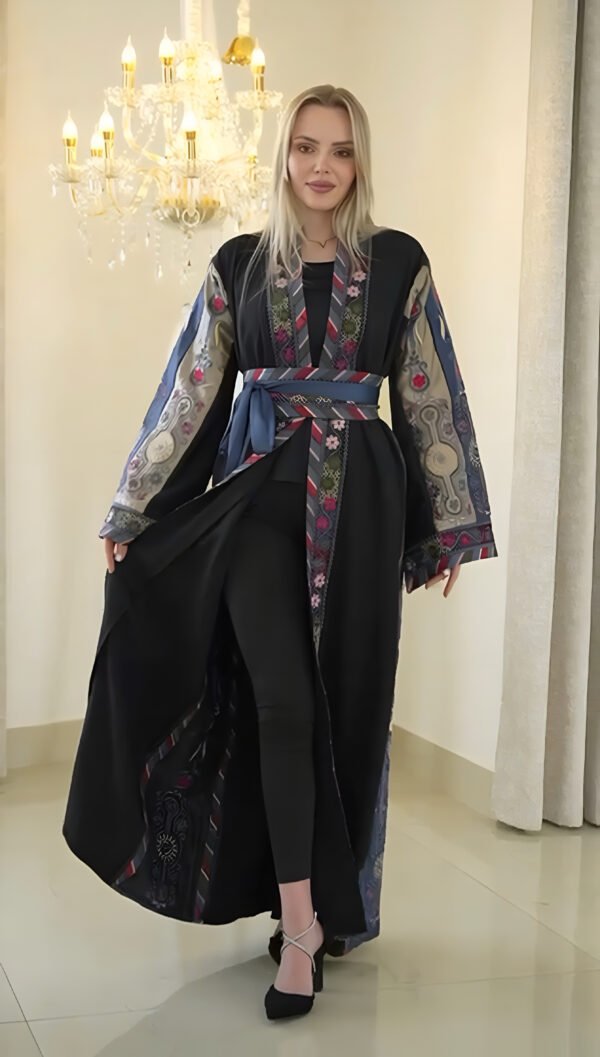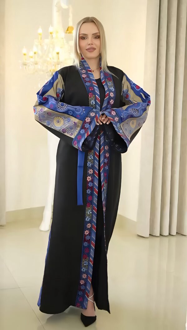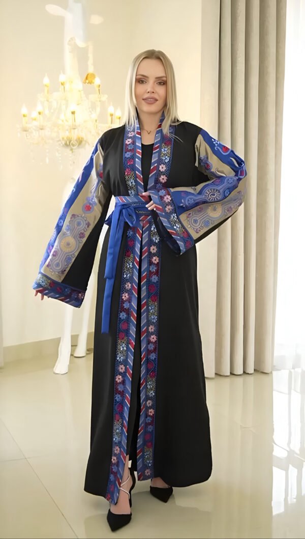 عباية فاخرة بتصميم ملكي يجمع بين الأناقة العصرية والفخامة الكلاسيكية. تأتي بلون أسود راقٍ يبرز التطريزات الغنية المستوحاة من الزخارف الشرقية، بتفاصيل فنية تمنح العباية حضورًا لافتًا ومترفًا.