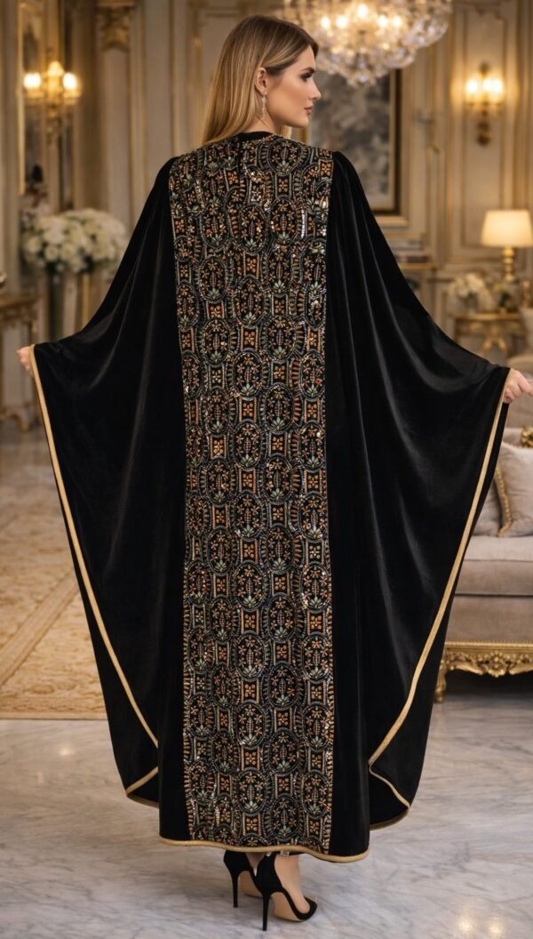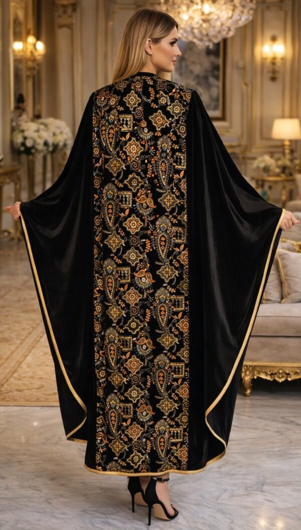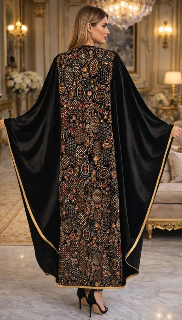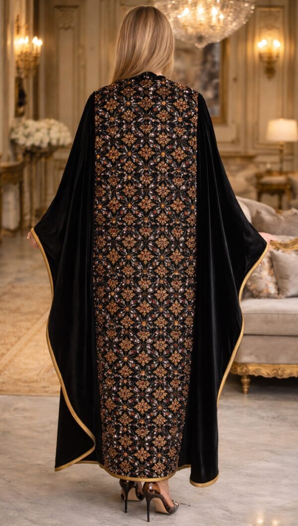 يتميز التصميم بتطريز فاخر يعزز الطابع الملكي للعباية ويبرزها كقطعة استثنائية تناسب المناسبات والسهرات الراقية.